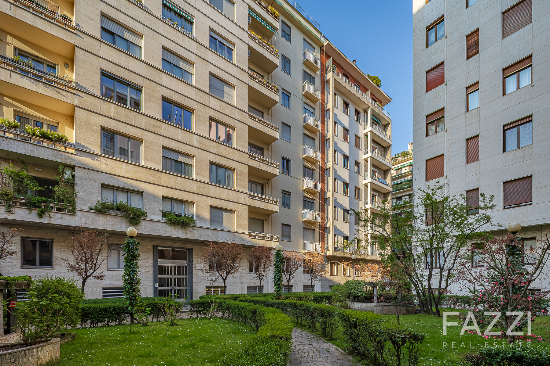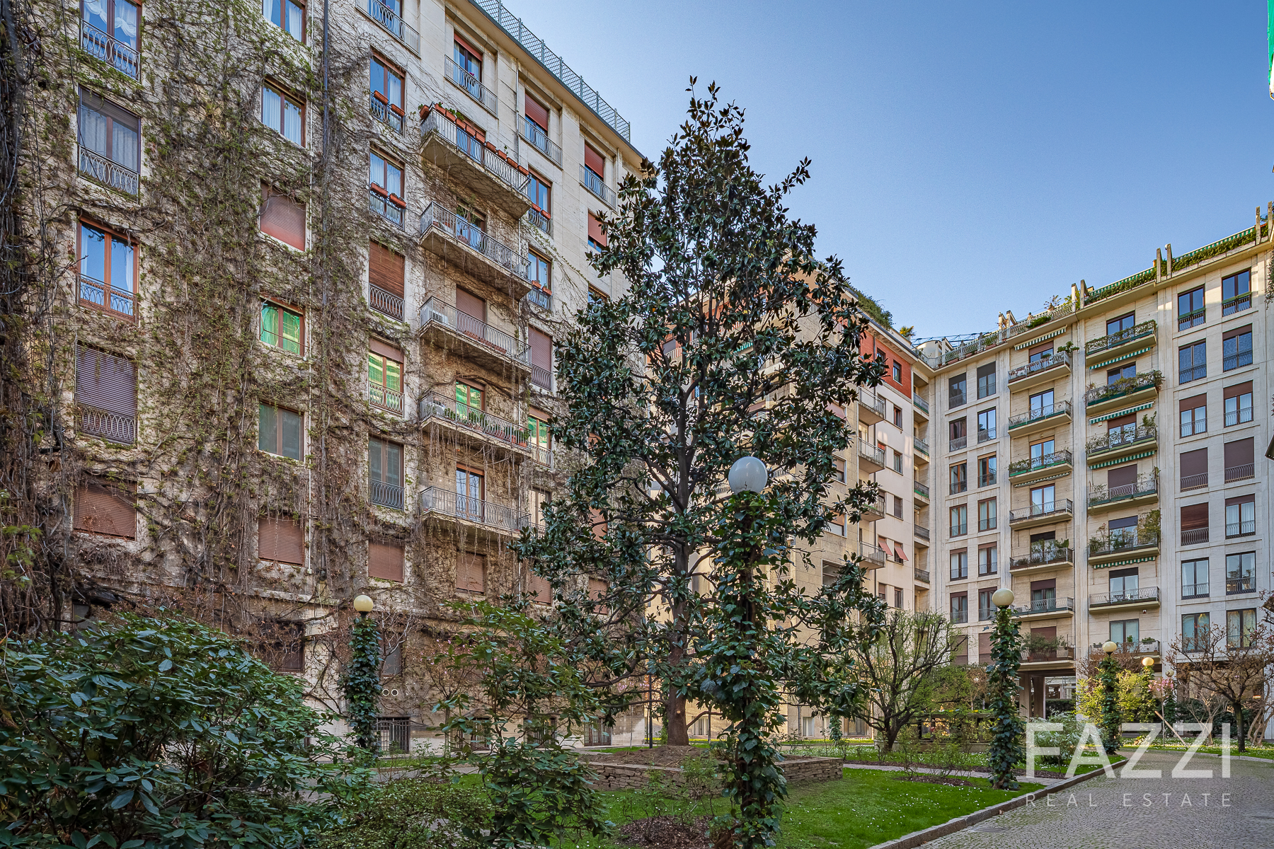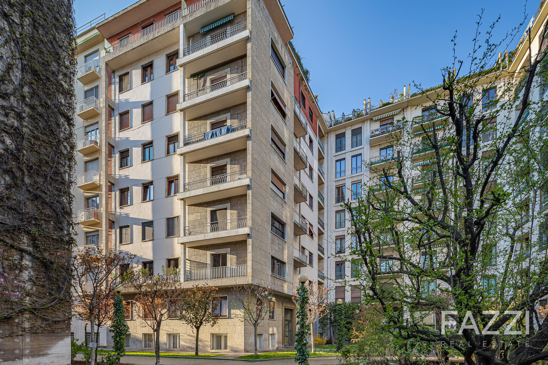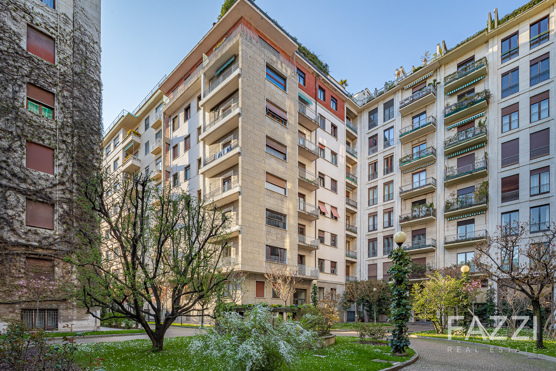 Nel cuore di Milano, a due passi dai rinomati Giardini Guastalla, proponiamo in vendita un raffinato appartamento sito al sesto piano di un signorile palazzo progettato nel 1954, firmato dall’architetto Bela Angelus, che viene citato come “palazzo verde”. L’immobile di 247 mq ed unico al piano, è così composto: ingresso, soggiorno doppio con accesso al balcone e ad un terrazzo affacciato sul verde del giardino condominiale, cucina abitabile, cinque camere da letto di cui due con bagno en suite e cabina armadio, altri due bagni di cui uno utilizzato come lavanderia.