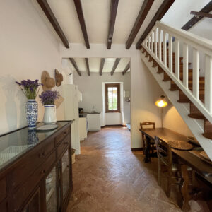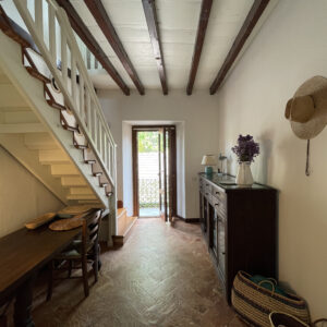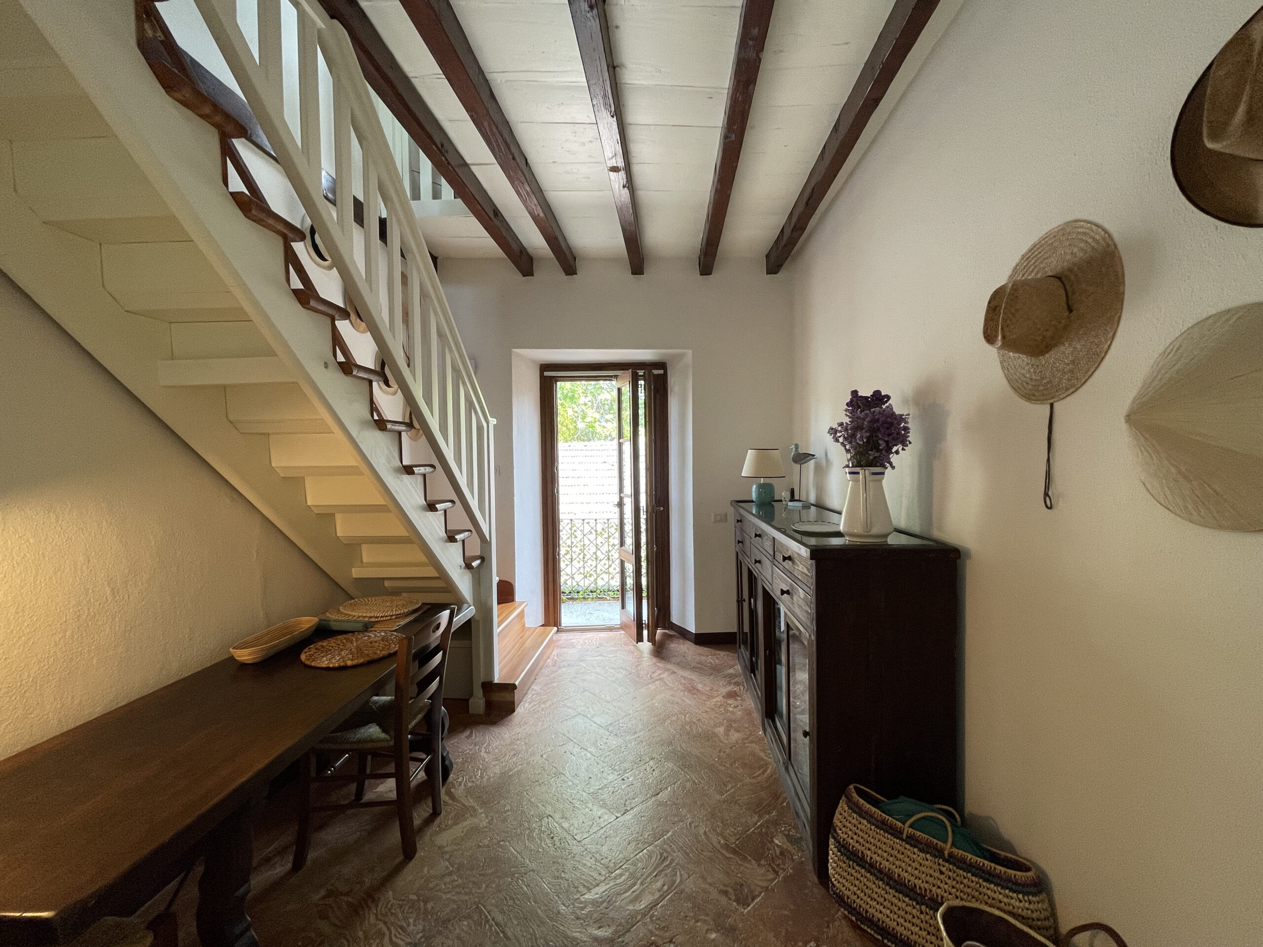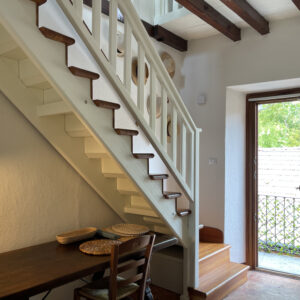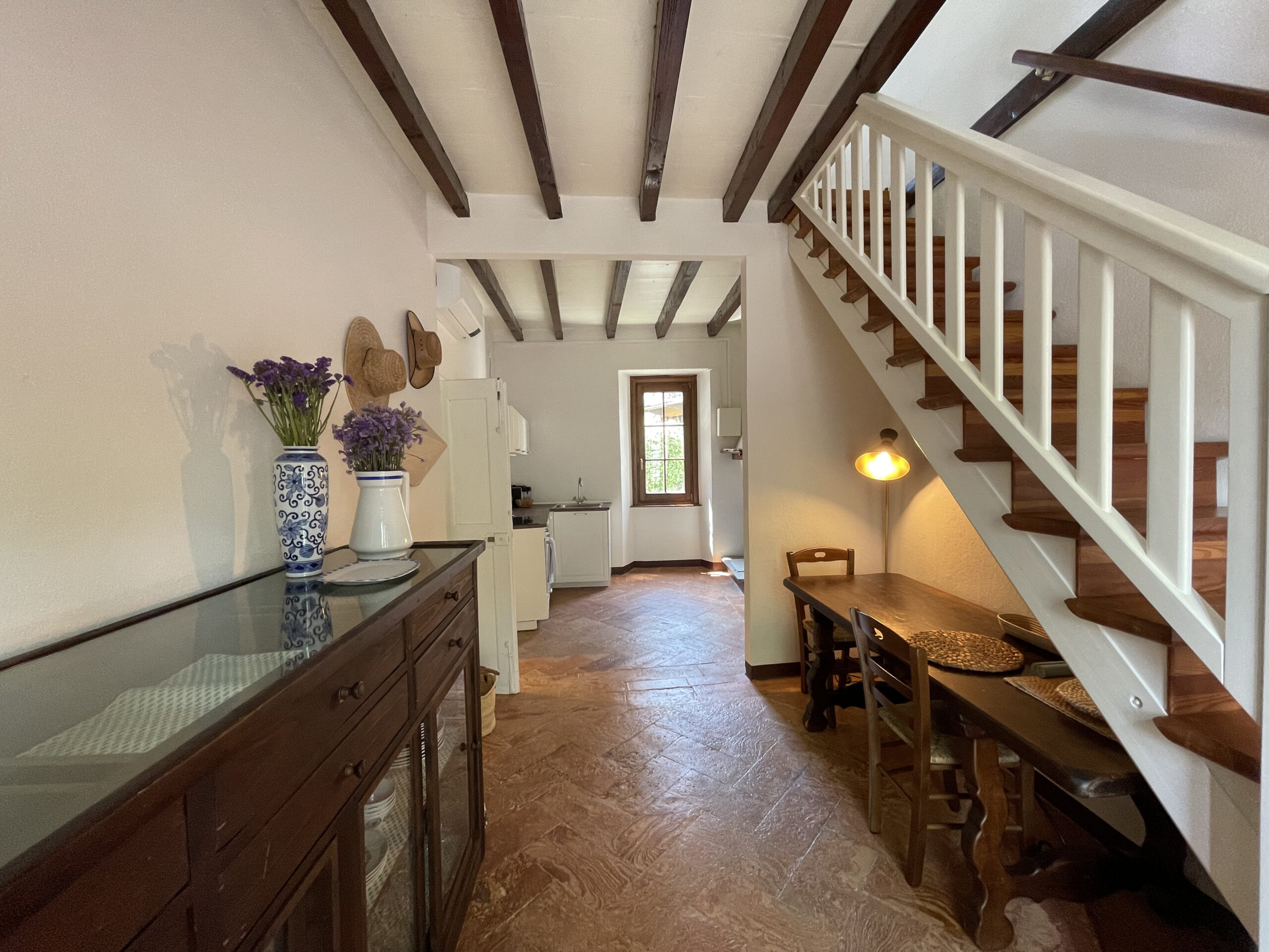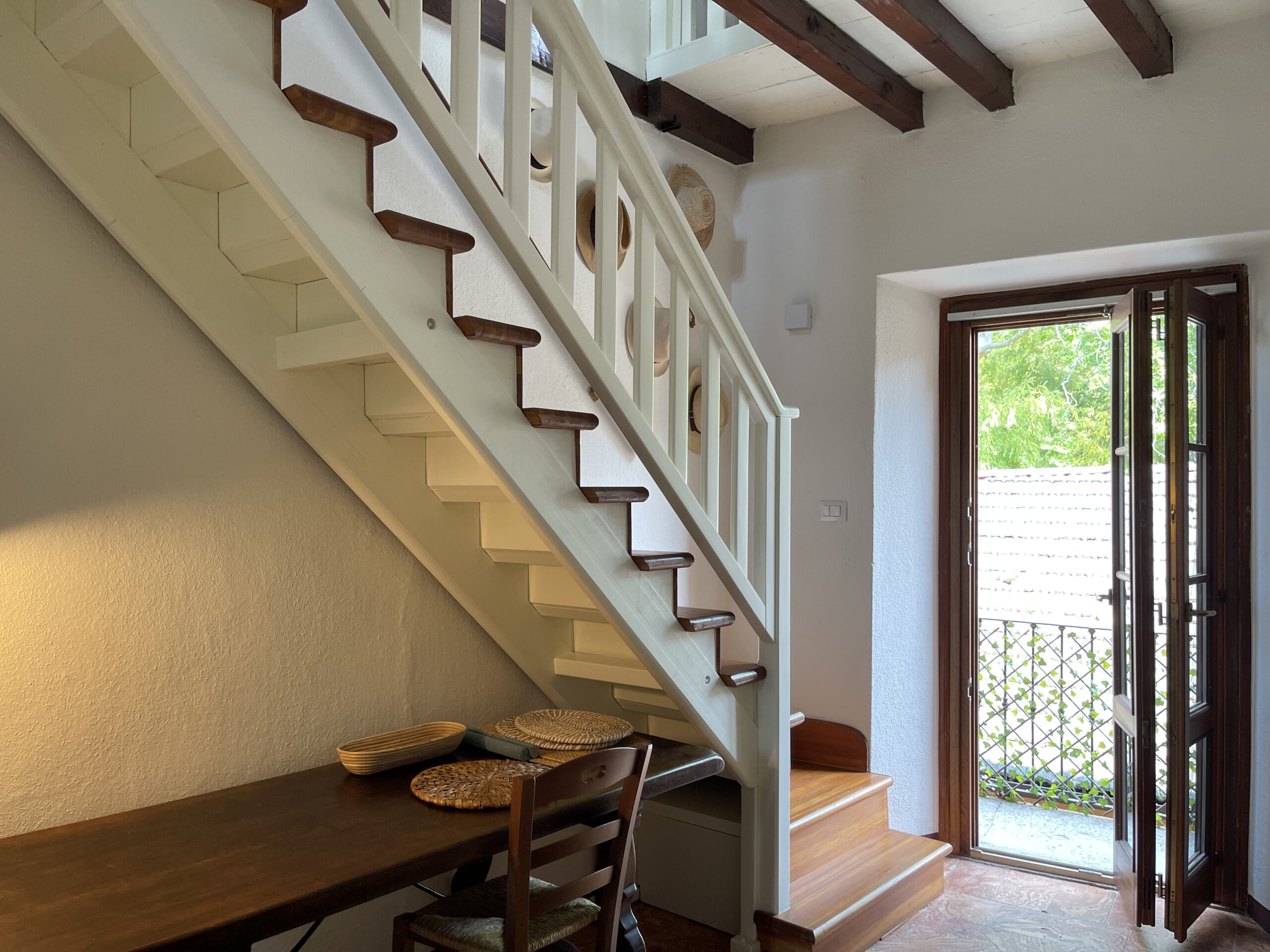 Una comoda scala conduce al piano superiore, dove troviamo ampio soggiorno con altra sala da pranzo con tavolo di legno che ospita fino a sei persone.