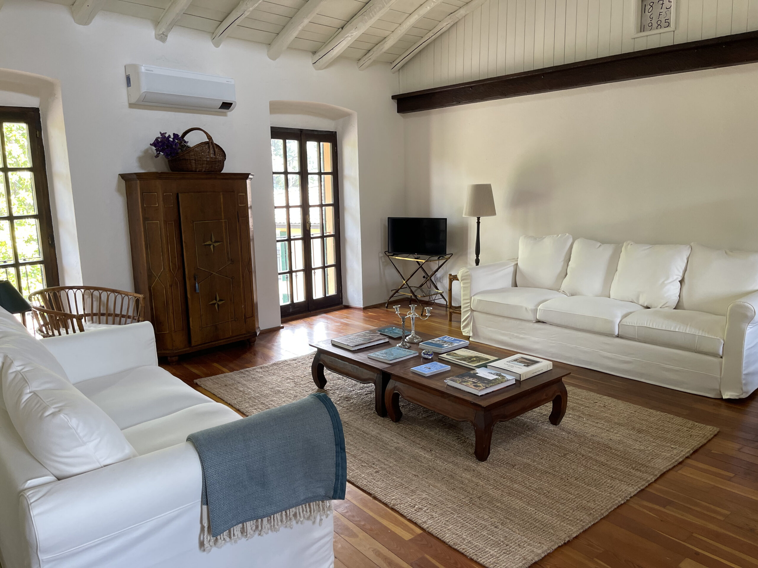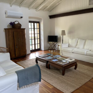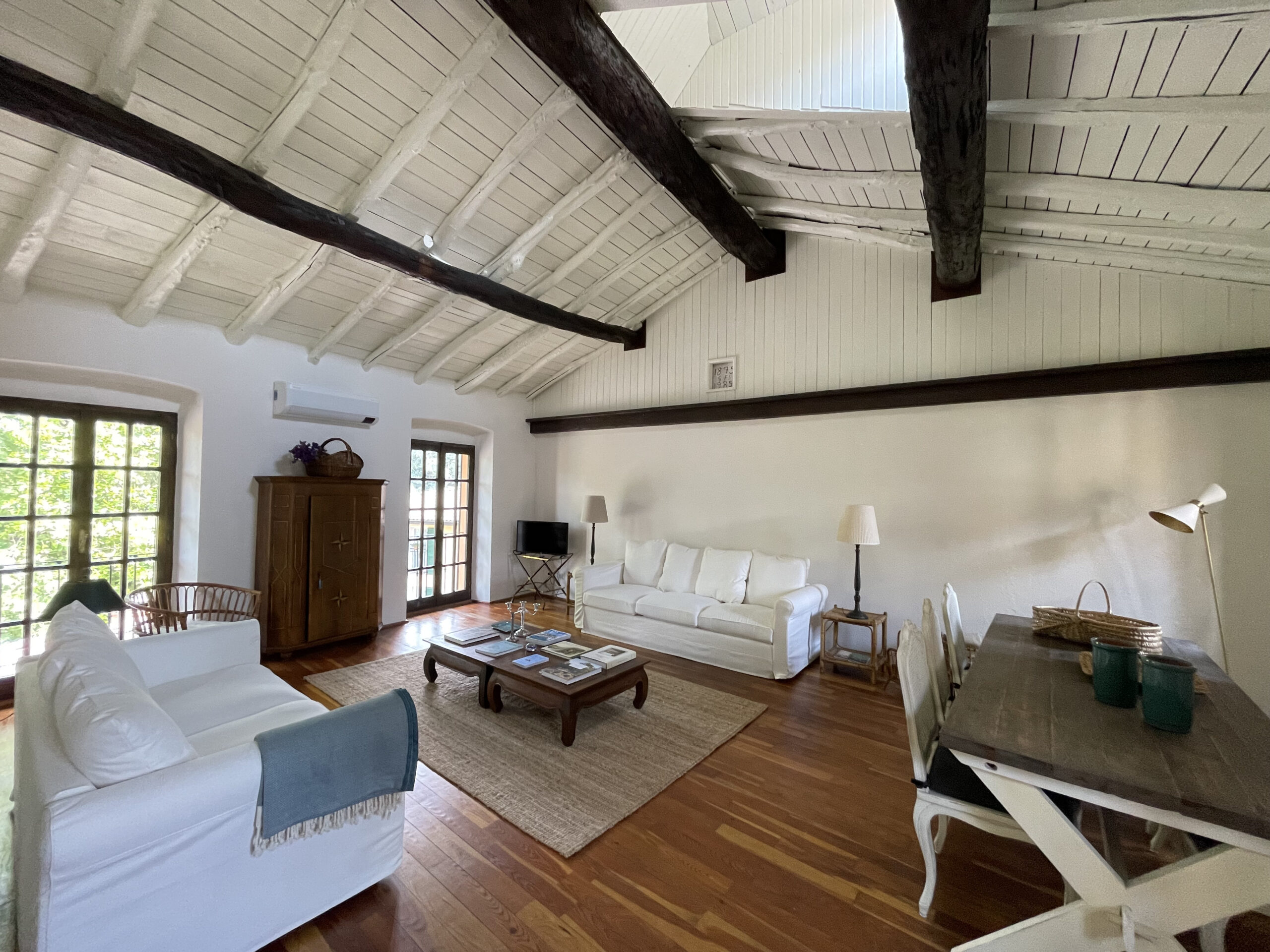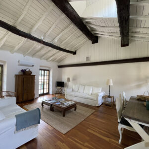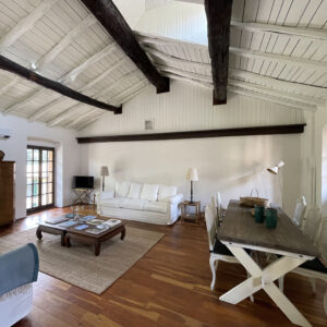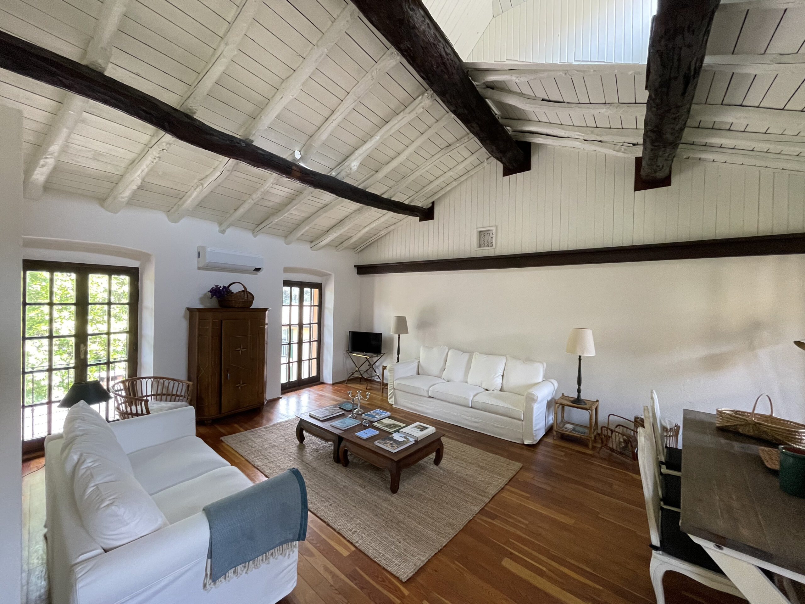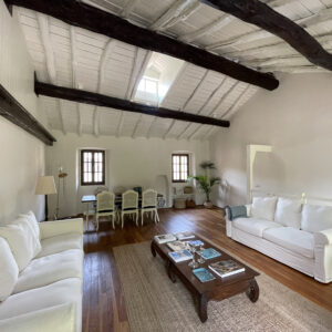 Nella zona living, divano letto matrimoniale e poltrone confortevoli, due porte finestre con vista panoramica. Il soffitto alto oltre i 4 metri, è caratterizzato da travi in legno originali.