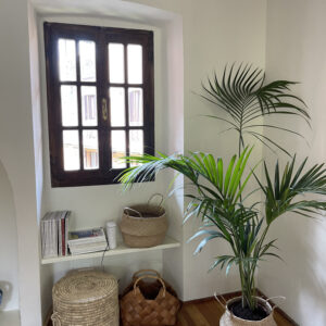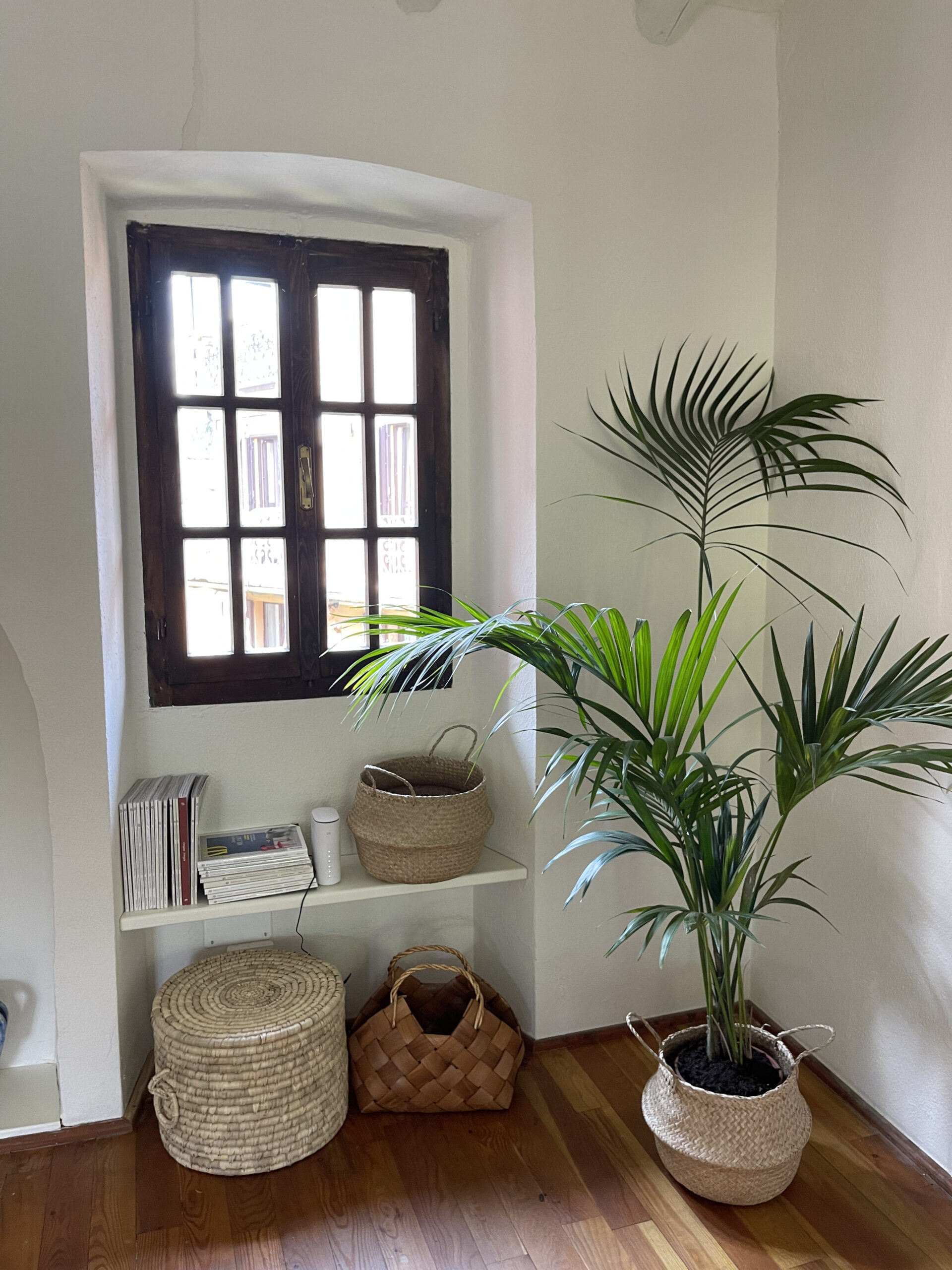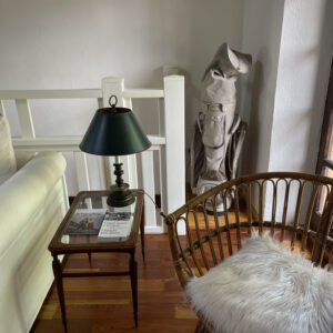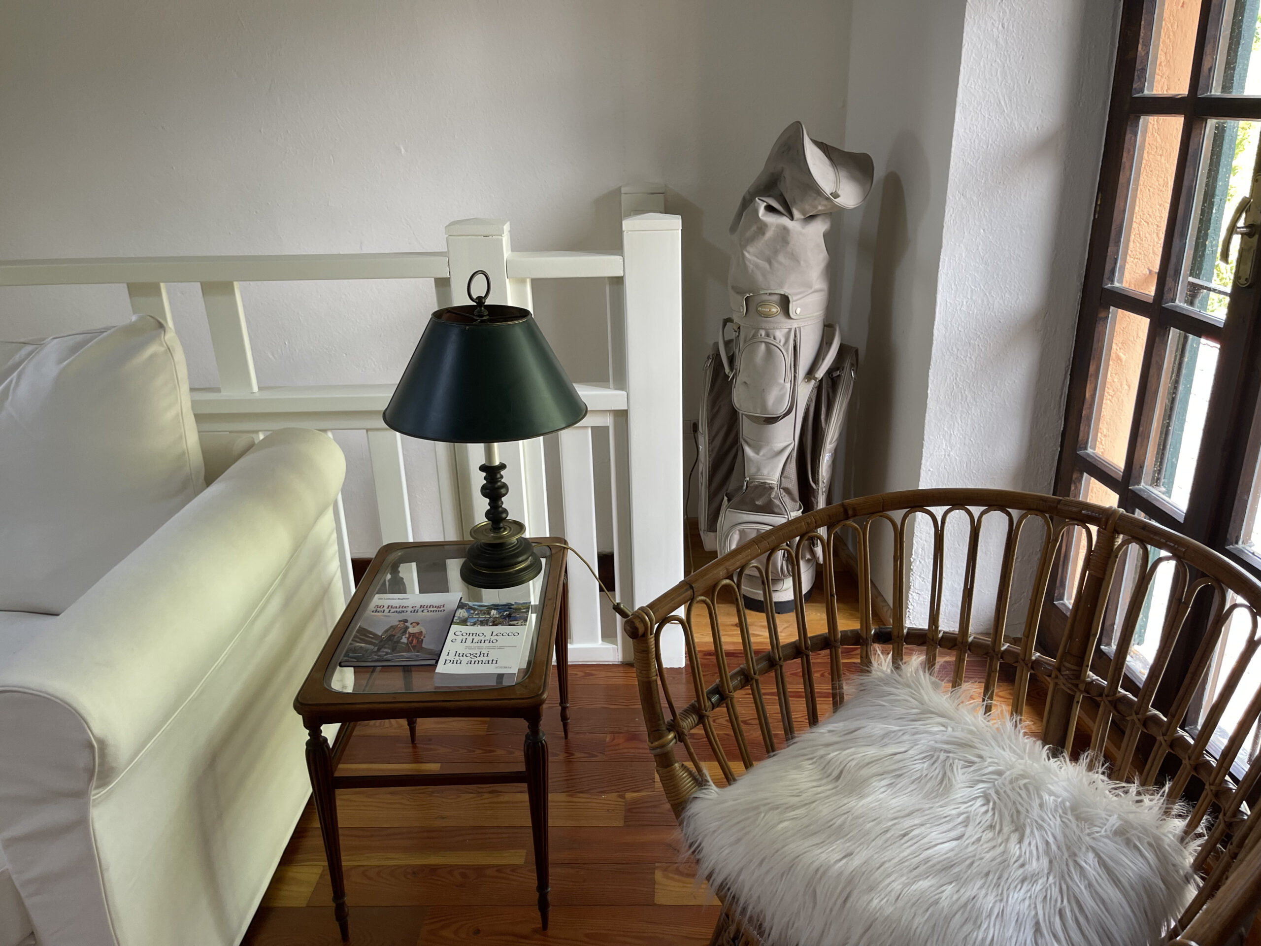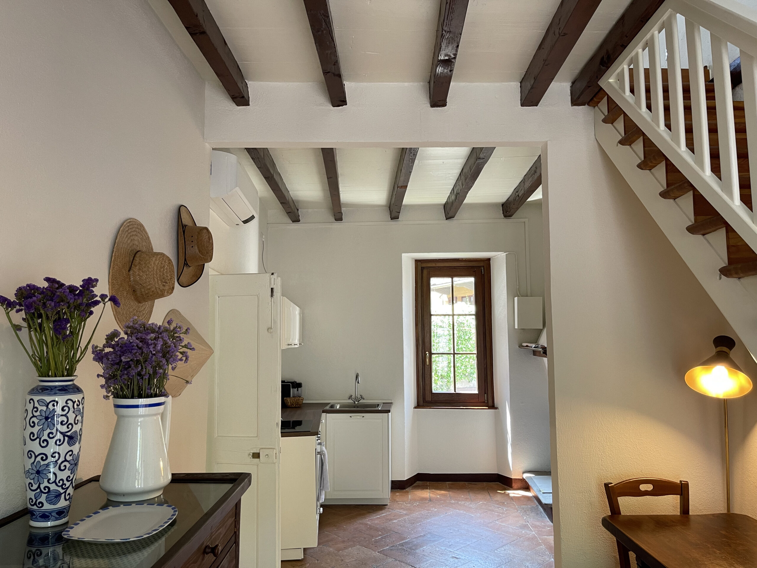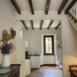 Nella zona living, divano letto matrimoniale e poltrone confortevoli, due porte finestre con vista panoramica. Il soffitto alto oltre i 4 metri, è caratterizzato da travi in legno originali.