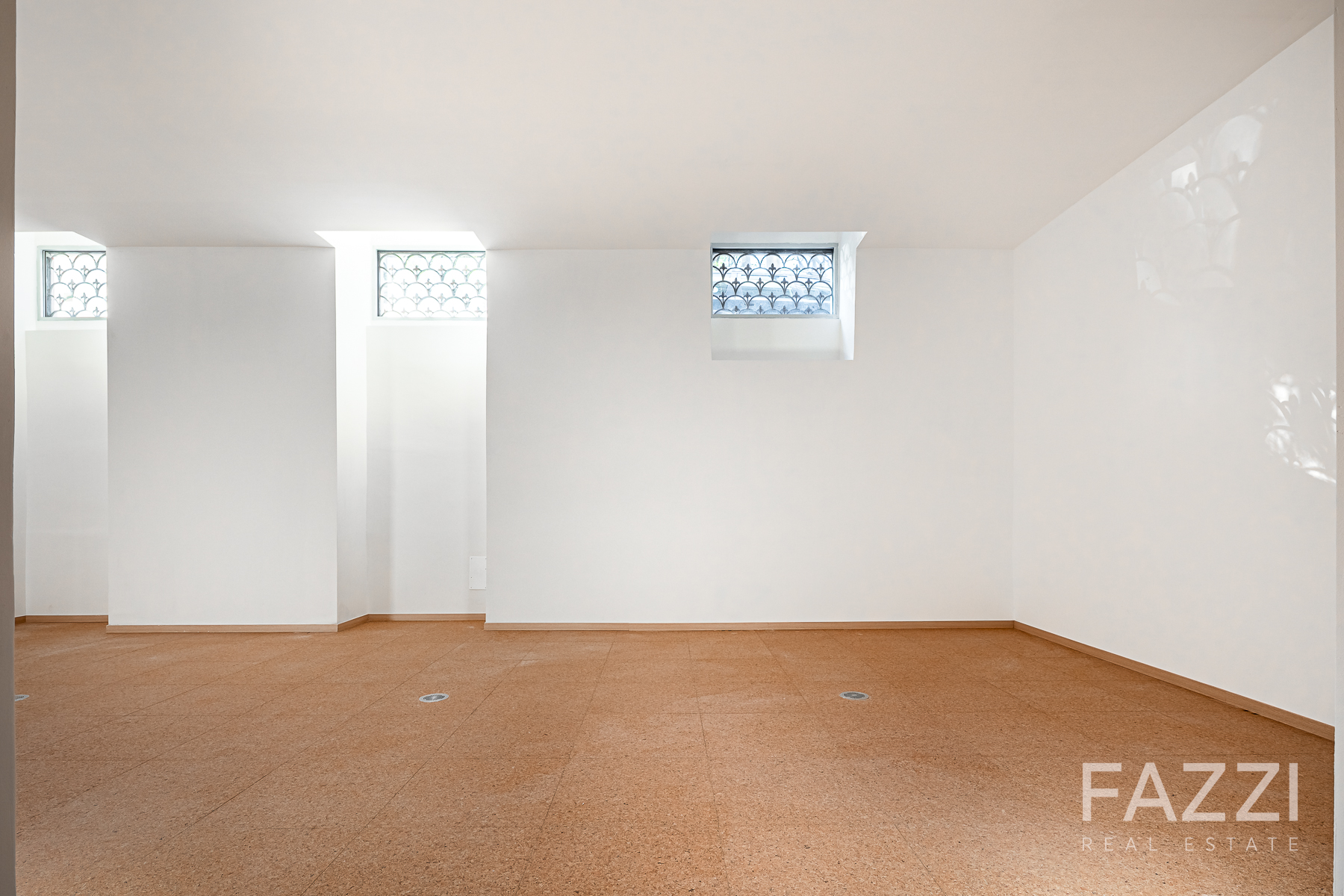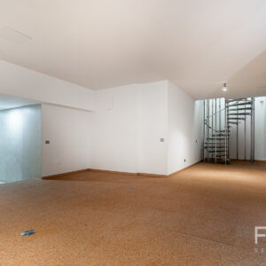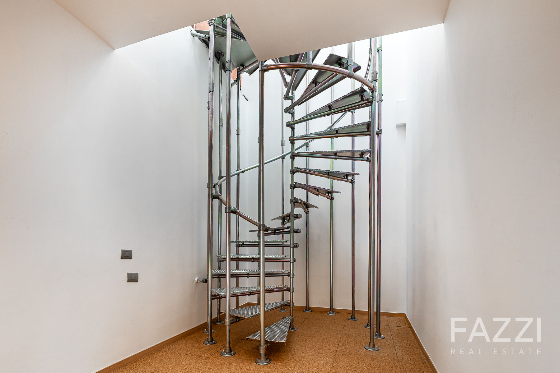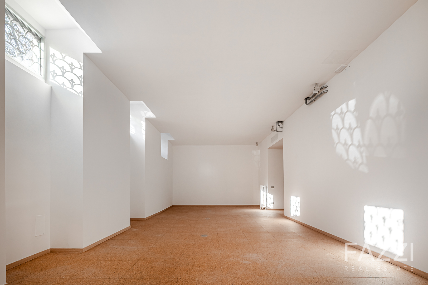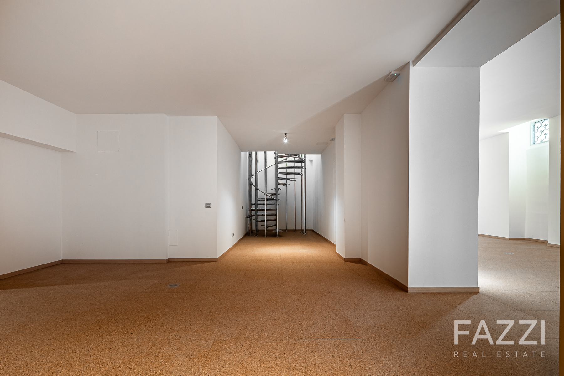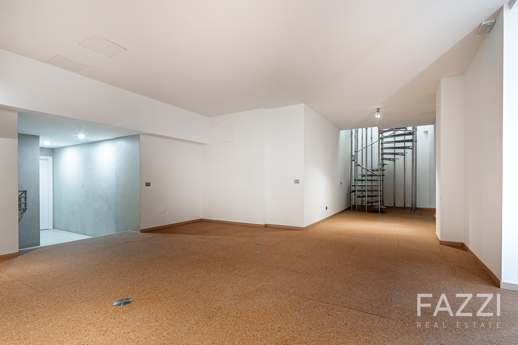 Entrando dal piano rialzato ci accoglie una grande scala che conduce al piano seminterrato. L’immobile risulta molto luminoso grazie alla posizione angolare e alle numerose vetrate. Pavimento galleggiante in sughero, impianto di VMC, predisposizione impianto aria condizionata, completamente cablato, infissi in alluminio in tripla camera, porta blindata elettrificata, altezze soffitti 4 mt.